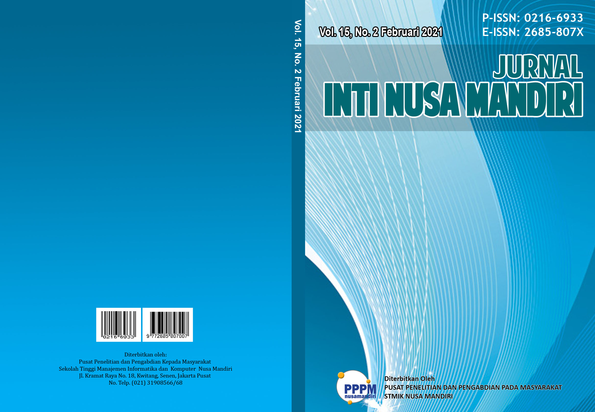 Jurnal INTI Nusa Mandiri merupakan jurnal yang diperuntukan keilmuan Computer science (Ilmu Komputer). membahas kajian tentang komputasi, perangkat keras (hardware) maupun perangkat lunak (software). Ilmu komputer mencakup beragam topik yang berkaitan dengan komputer, mulai dari analisis abstrak algoritma sampai subyek yang lebih konkret seperti bahasa pemrograman, perangkat lunak, termasuk perangkat keras. Pada terbitan Jurnal INTI jilid 15 No 2 Februari 2021 memuat 9 Artikel dengan jumlah author sebanyak 21 yang berasal dari institusi Sekolah Tinggi Teknologi Botang, Universitas Bina Sarana Informatika dan STMIK Nusa Mandiri. Jurnal INTI Nusa Mandiri Terakreditasi SINTA 4 dan memiliki P-ISSN: 0216-6933, E-ISSN: 2685-807X.