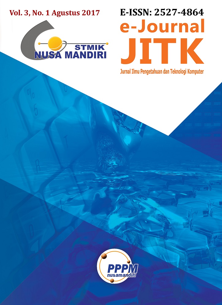 Vol. 3 No. 1 (2017)JITK (Jurnal Ilmu Pengetahuan dan Teknologi Komputer) Volume 3 Number 1 published in August 2017, is a Journal published by the Center for Research and Community Service (PPPM) STMIK Nusa Mandiri. Frequency of Mid-Year Issuance (2 times a year, namely February and August). Contains a collection of topics related to the collection / accumulation of new knowledge, empirical observations or research results, and the development of new ideas or proposals in the field of science related to computer science.