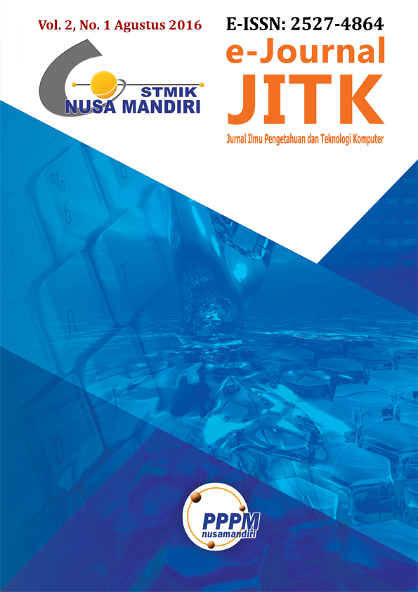 Vol. 2 No. 1 (2016)JITK (Jurnal Ilmu Pengetahuan dan Teknologi Komputer) Volume 2 Number 1 published in August 2016, is a Journal published by the Center for Research and Community Service (PPPM) STMIK Nusa Mandiri. Frequency of Mid-Year Issuance (2 times a year, namely February and August). Contains a collection of topics related to the collection / accumulation of new knowledge, empirical observations or research results, and the development of new ideas or proposals in the field of science related to computer science.