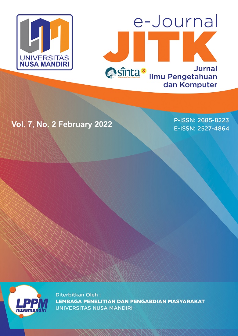 Vol. 7 No. 2 (2022)JITK (Journal of Computer Science and Technology) Volume 7 Number 2, published in February 2022, is a Journal published by the Center for Research and Community Service (LPPM) Universtias Nusa Mandiri. In the issue of volume 7 number 2 contains 11 articles with the origin of the author's institute totaling 10 institutes (Universitas Muhammadiyah Surakarta, Institut Teknologi dan Bisnis BRI, STMIK Pelita Nusantara, Universitas Jendral Soedirman, Universitas AMIKOM Purwokerto, Universitas Persada Indonesia YAI, STMIK Widuri, Politeknik Negeri Media Kreatif, Sekolah Tinggi Ekonomi Islam SEBI and Universitas Nusa Mandiri). Frequency of Mid-Year Issuance (2 times a year, ie February and August). JITK has ISSN: 2685-8223 (Print Media) and ISSN: 2527-4864 (Online Media). DOI Prefix: 10.33480. JITK Journal contains a collection of topics relating to the collection/accumulation of new knowledge, empirical observations or research results, and the development of new ideas or proposals in the field of science related to computer science.