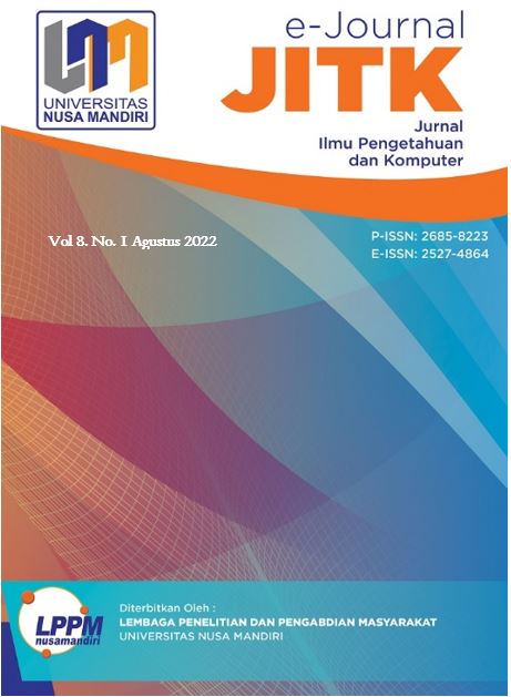 Vol. 8 No. 1 (2022)JITK (Journal of Computer Science and Technology) Volume 8 Number 1, published in August 2022, is a Journal published by the Center for Research and Community Service (LPPM) Universtias Nusa Mandiri. Frequency of Mid-Year Issuance (2 times a year, ie February and August). JITK has ISSN: 2685-8223 (Print Media) and ISSN: 2527-4864 (Online Media). DOI Prefix: 10.33480. JITK Journal contains a collection of topics relating to the collection/accumulation of new knowledge, empirical observations or research results, and the development of new ideas or proposals in the field of science related to computer science.