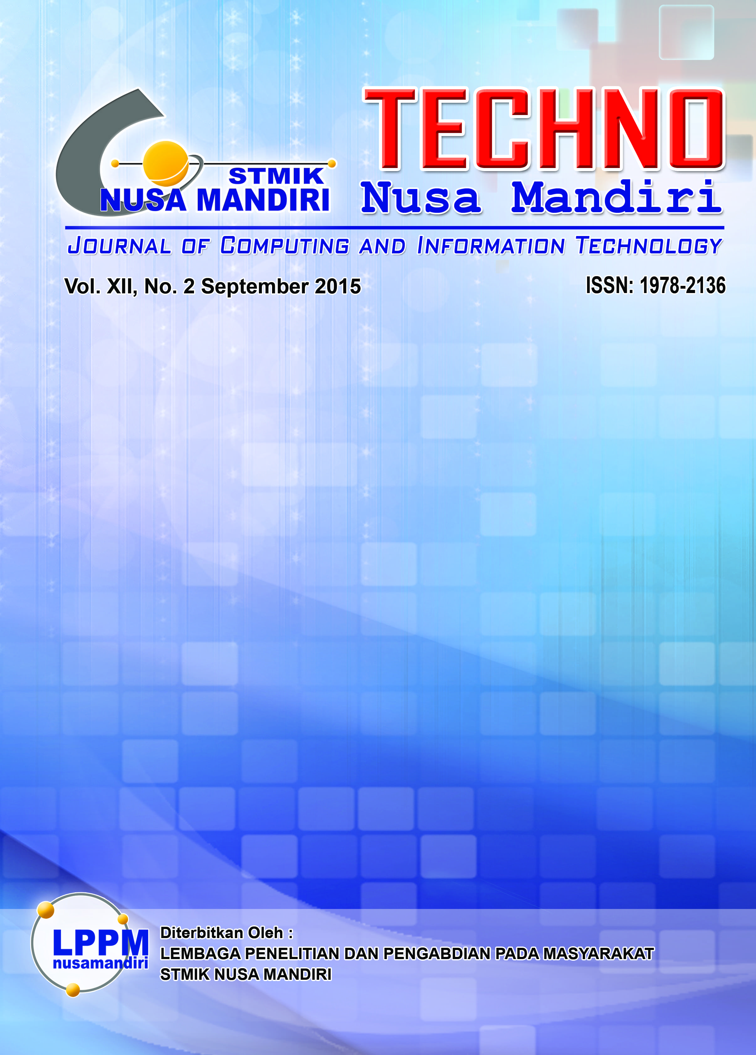 Vol. 12 No. 2 (2015)Techno Nusa Mandiri : Journal of Computing and Information Technology merupakan jurnal ilmiah yang diterbitkan PPPM STMIK Nusa Mandiri. Jurnal ini berisi tentang karya ilmiah yang bertemakan: Teknik Informatika, Teknik Komputer, Robotika, Jaringan Komputer, Mobile Computing, Mobile Application, Sistem Penunjang Keputusan, Sistem Kecerdasan Buatan, Data Mining, Pengolahan Citra, Algoritma Genetika, Perancangan Bangun Sistem Informasi, Business Intelligence, Knowledge Management, Database System, Big Data, Internet Think, Energy Management, Enterprise Computing, dan Technology Management