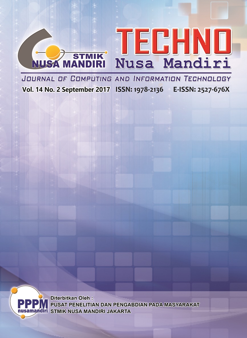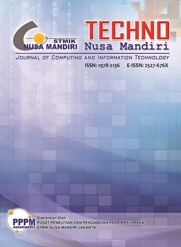 Vol. 14 No. 2 (2017)Techno Nusa Mandiri : Journal of Computing and Information Technology merupakan jurnal ilmiah yang diterbitkan PPPM STMIK Nusa Mandiri. Jurnal ini berisi tentang karya ilmiah yang bertemakan: Teknik Informatika, Teknik Komputer, Robotika, Jaringan Komputer, Mobile Computing, Mobile Application, Sistem Penunjang Keputusan, Sistem Kecerdasan Buatan, Data Mining, Pengolahan Citra, Algoritma Genetika, Perancangan Bangun Sistem Informasi, Business Intelligence, Knowledge Management, Database System, Big Data, Internet Think, Energy Management, Enterprise Computing, dan Technology Management